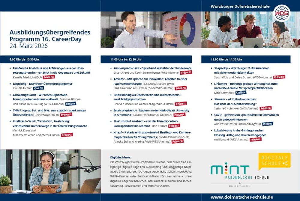 Die Würzburger Dolmetscherschule ist eines der bundesweites Kompetenzzentren für Fremdsprachenberufe. Deshalb veranstalten wir jährlich einen CareerDay, an dem professionelle Fremdsprachenspezialist*innen Workshops zu berufsrelevanten Fragen anbieten. Auch bei Unternehmen ist die Veranstaltung gefragt, um Kontakte zu Berufsanfänger*innen zu knüpfen und gut ausgebildetes Personal zu finden.